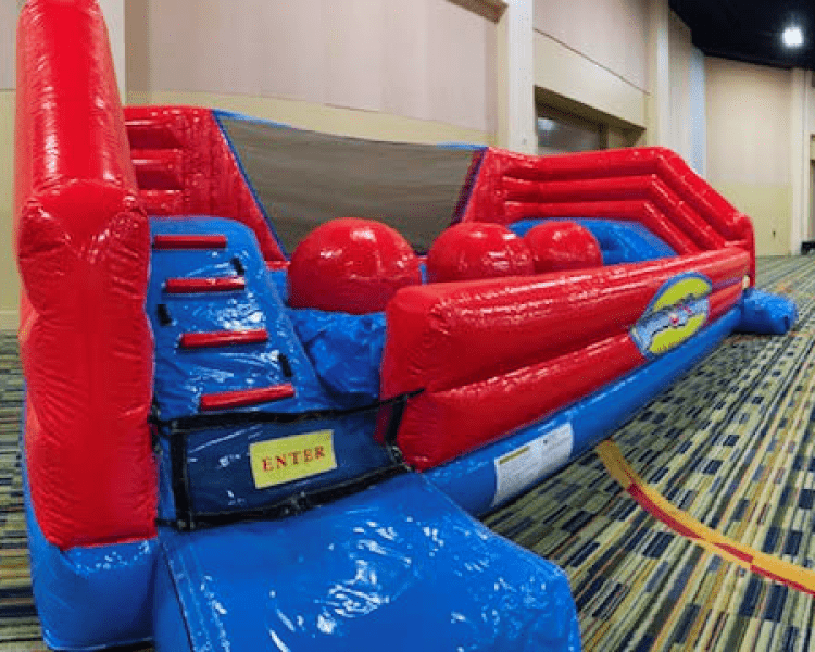 Can you make it across without falling? The Big Baller Game features a series of giant, inflatable red balls set in the center of a cushioned course. Participants climb up the ladder at either end and attempt to hop, skip, and jump their way across the balls—without touching the floor! The balls bounce and move, making each attempt uniquely challenging and hilarious. If you fall, don’t worry—just get back in line and try again!