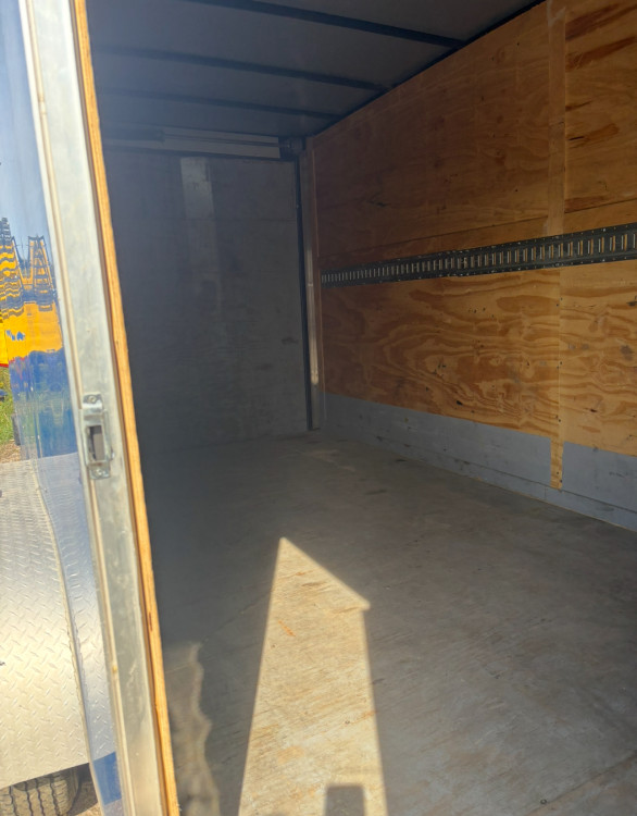 This trailer measures 7 feet wide by 16 feet long with a sturdy dual-axle design rated for up to 8,200 lbs of cargo. It includes interior shelving for organized storage, an E-Track system for secure tie-downs, a rear ramp and side access door for easy loading, and interior lighting for convenience at any time of day.