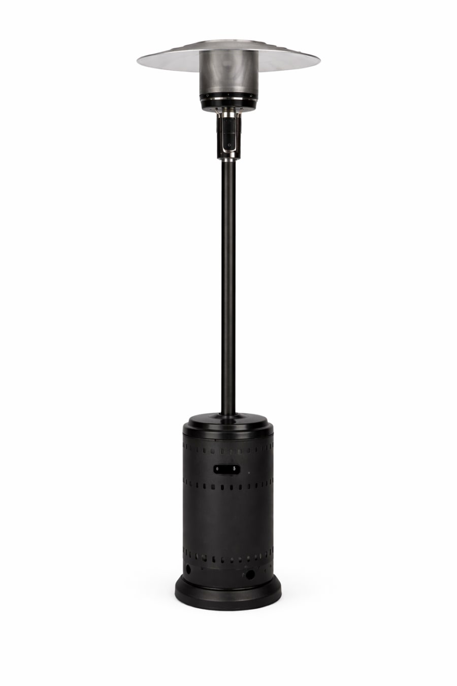 A tall, freestanding outdoor patio heater